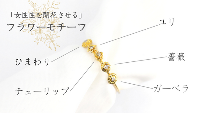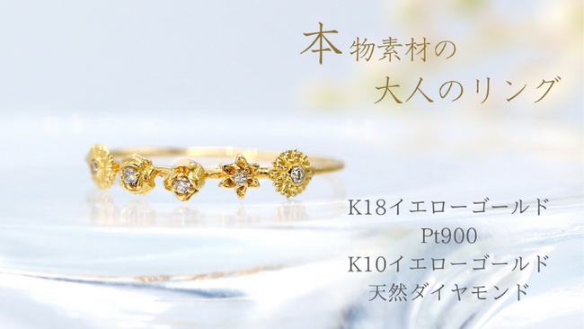 人気のフラワーモチーフ「バラ」「ひまわり」「チューリップ」「ガーベラ」「ユリ」を、1本のリングにしました。素材は価値のある本物にこだわり“K18イエローゴールド” “プラチナ900” “K10イエローゴールド”の3種類です。
