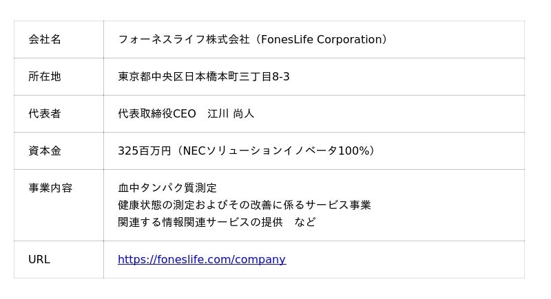 フォーネスライフは、デジタル技術でヘルスケア領域にソリューションを提供するNECソリューションイノベータが100%出資する会社です。米国SomaLogic社の血中タンパク質測定技術と、NECグループのビッグデータ解析・先端ICTを用い、認知症などの将来の疾病リスク予測に基づく、一人ひとりに適した生活習慣の改善提案を行うことで、“誰も病気にならない未来”、“誰もが自分らしく生きられる社会”の実現を目指しています。