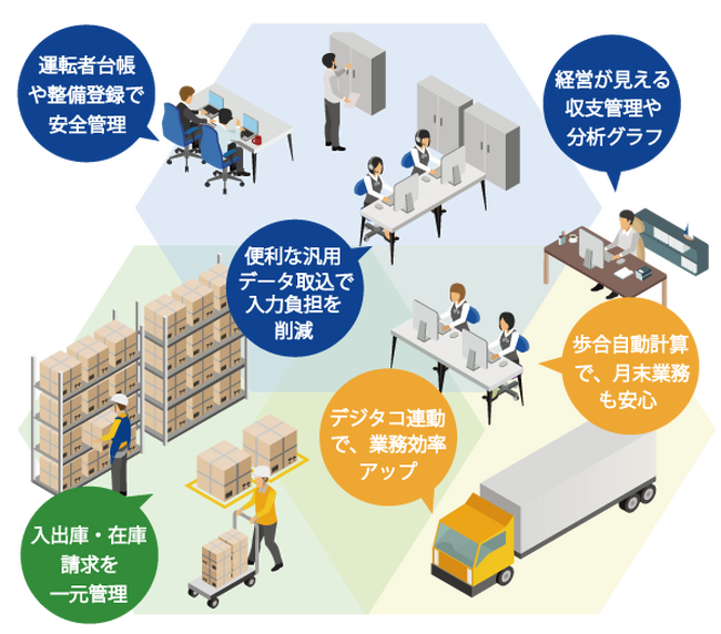 一番星?楽部は、物流・運送業界で30年以上の実績があるシステムギア社が提供する、複雑多様化する業務に対応するシステムを提供するソリューションです。 販売管理、勤怠管理、倉庫管理の一連のシリーズで網羅され、請求管理、車輛管理、乗務員台帳、給与管理から燃費や経営分析まで様々なニーズに対応し、業界No.1の6500本以上の導入実績を誇ります。 もちろんクラウド化、インボイスも対応済みで、カスタマイズしなくてもマスターデータを取り込めばそのまま使えるのが特徴です。汎用的なデータ取り込みを標準装備しており、オープンで既存のシステムと繋ぎやすいのも簡単に始められる理由の1つとして評価されています。