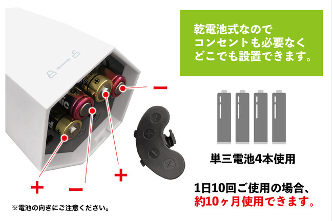 また乾電池式のコードレス仕様ですので、どこでも設置・移動が可能です。
