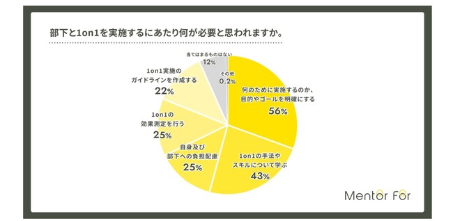 また、部下と1on1を実施するにあたり必要と感じることは、多い順に「何のために実施するのか、目的やゴールを明確にする(56%)」「1on1の手法やスキルについて学ぶ(43%)」「自身および部下への負担配慮(25%)」「1on1の効果測定を行う(25%)」「1on1実施のガイドラインを作成する(22%))」という回答結果となりました。