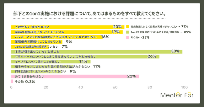 2大課題は、「実施負担に対して効果が実感できないこと」と「1on1のスキル/知識不足」