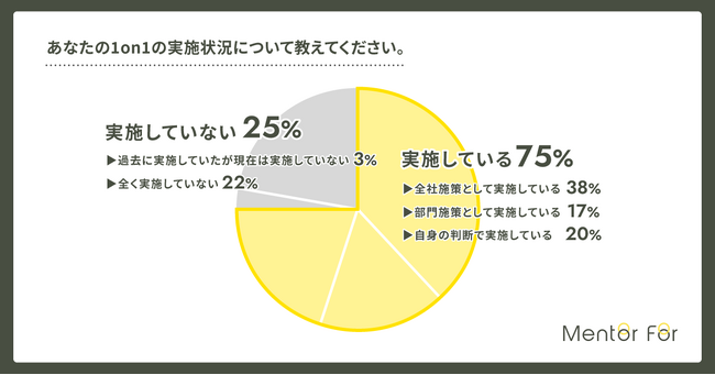 Mentor Forはこれまで組織開発の効果的な手法のひとつとして「キャリア1on1(※1)」を推奨してまいりました。最近では、リモート環境の加速化や、メンバーの価値観の多様化により、さらに1on1の必要性が認知されています。そこで、企業の1on1の実施実態を把握し、現場の課題感を探るためにアンケート調査を行いました。