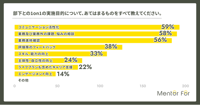 1on1の目的について質問したところ「コミュニケーションの活性化(59%)」「業務および業務以外の課題、悩み相談(59%)」「業務進捗確認(57%))」など日頃の業務遂行がスムーズにすることが主目的であることがわかりました。