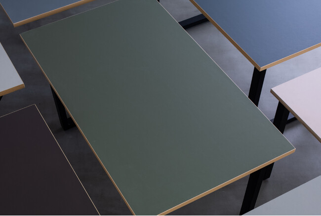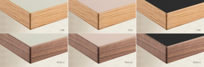 当社で展開するリノリウムコレクションには、豊富な天板カスタマイズをご用意。表面のカラーを21色からインテリアスタイルや好みに合わせて選んだ上で、縁取りとなる側面の木口をオーク材とウォルナット材の2種類からお選びいただくことができるようになりました。