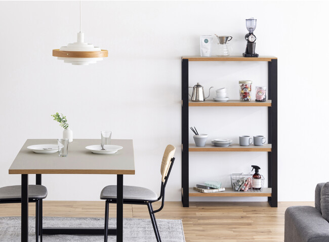 棚板の幅を60-120cmから1cm間隔でサイズオーダーできる、ミニマルなデザインで仕上げた4段タイプのシェルフです。アイアンとリノリウムの魅力をシンプルに引き立て、無駄を省いたスタイリッシュなデザイン。無造作に物を置いてもセンス良くまとまります。