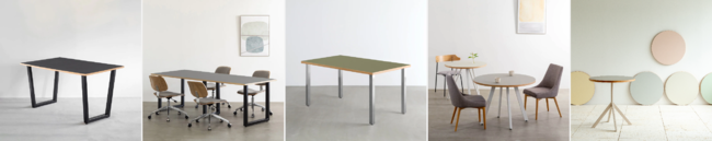 当社では、機能性の高い素材としてファニチャーリノリウム全21色を使用したプロダクトを2020年から展開。THE TABLEをはじめとして、THE CAFE TABLEシリーズ、法人のお客様向け・特別サイズのデスク等。今後もリノリウムを取り入れたTHEシリーズの拡充を進めてまいります。