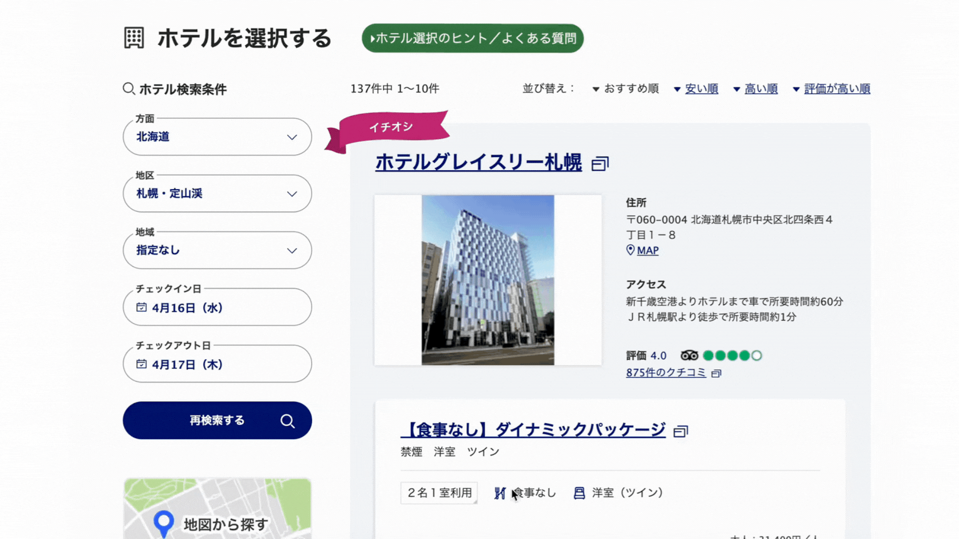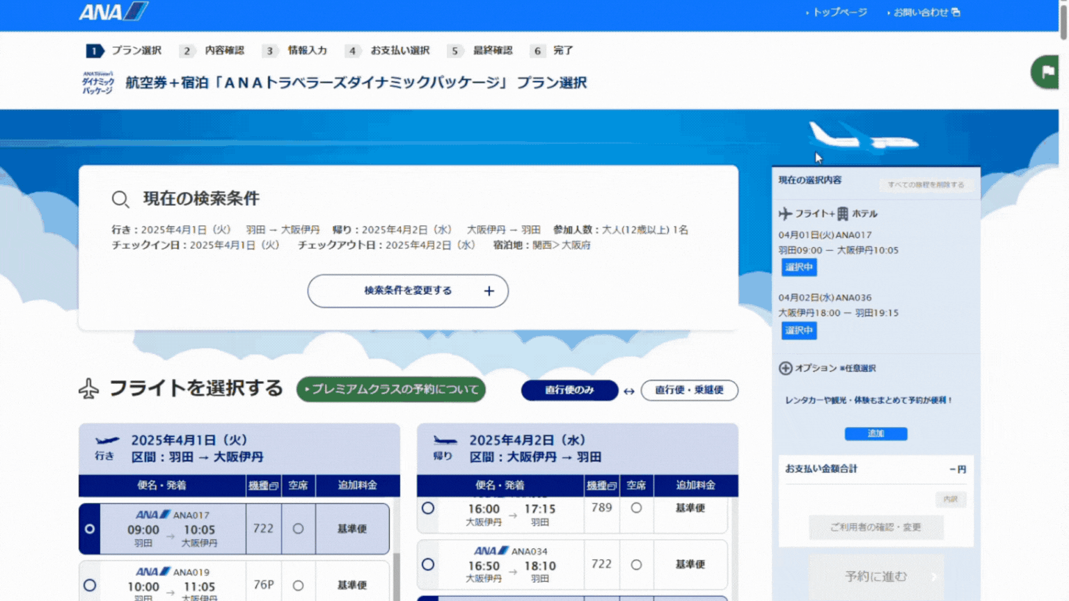 国内線航空券+宿泊「ANAトラベラーズ ダイナミックパッケージ」の予約画面の右上にガイドを常時表示しお客様の目的に応じた操作方法をチュートリアル形式で案内。画面上の操作を直感的に示しています。