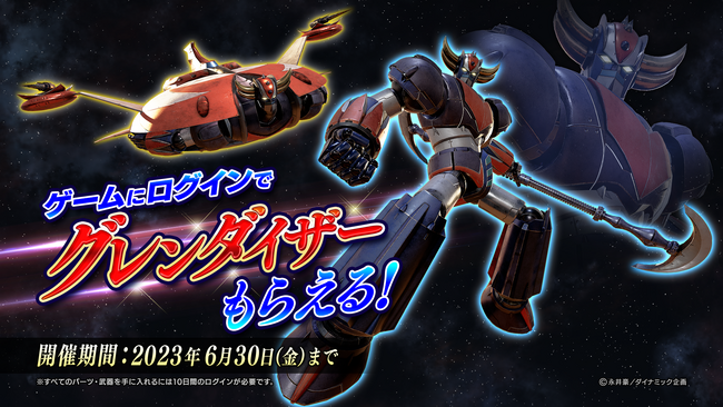 期間内に10日間、一日一回ゲームを起動すると、ログインボーナスとして、グレンダイザーのパーツや武器「ダブルハーケン」を入手できる他、グレンダイザーの必殺技「スペースサンダー」「スクリュークラッシャーパンチ」を解放するために必要な素材も手に入れることができます。さらに、全てのパーツを装備してミッションに出撃すると、スペイザーと合体して戦うことも可能!