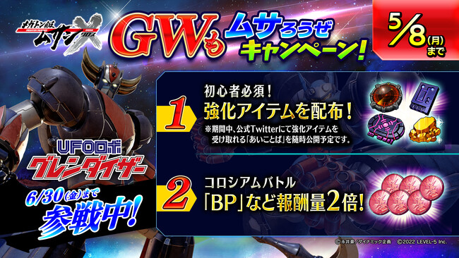 本日4月27日(木)より「GWもムサろうぜキャンペーン!」を開催!パーツや武器などの強化素材アイテムの配布や、対人戦「コロシアムバトル」での報酬が一定時間2倍になるなど、様々なお得なキャンペーンを実施します。