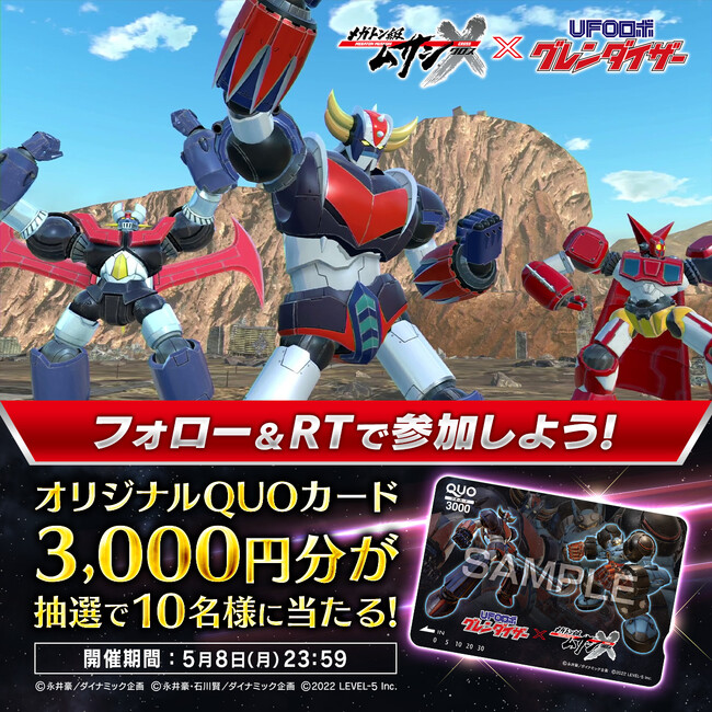 「メガトン級ムサシ」公式Twitterをフォローし、対象ツイートをリツイートした方の中から抽選で10名様に、本ゲームの主役機「ムサシ」と、コラボ機体「グレンダイザー」が描かれたオリジナルQUOカード3,000円分をプレゼントします。