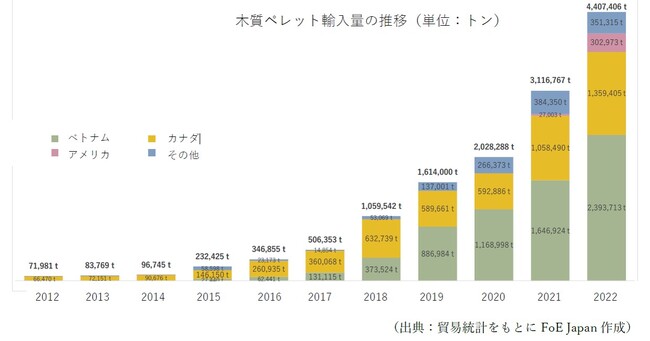 固定価格買取制度が導入された2012年以降、日本の木質ペレットの輸入量は急増しています。2022年、日本はカナダから130万トン以上の木質ペレットを輸入しました。