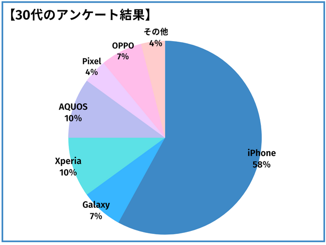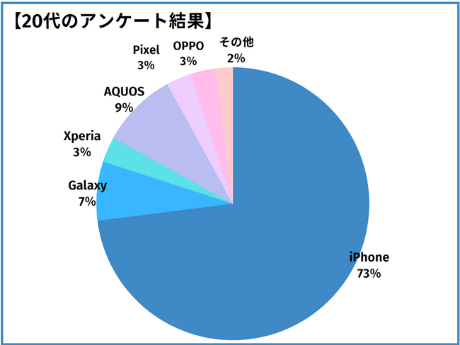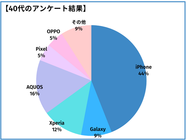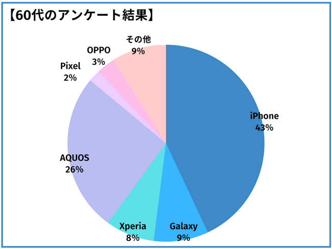 全年代でiPhoneの使用率は高いですが、年齢が上がるにつれてその率は少し低下しています。特に20代では最高の73%に達していますが、40代、50代、60代ではそれぞれ44%、42%、43%と減少しています。