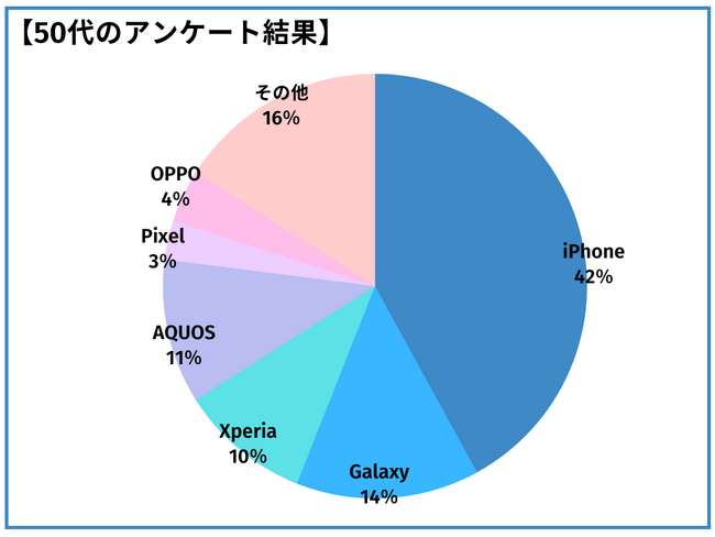 特にGalaxyは50代で14%と最高になっていますが、これはSamsungのスマートフォンが高齢者にも使いやすいUIや、高品質なカメラなどを備えているためかもしれません。