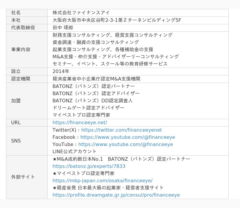 日本最大級のM&Aプラットフォームである『BATONZ(バトンズ)』の認定パートナーとして活動を開始した事で、これまでの資金調達やファイナンスの支援にプラスして、中小企業の事業承継やスモールM&AやM&Aによる起業や個人のM&Aの支援を通して、スタートアップの創出と育成、地方創生と日本経済の発展に寄与してまいります。