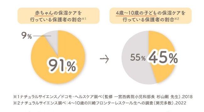 今では、赤ちゃんの毎日のスキンケアは常識となっていますが、幼児期になるとスキンケアを習慣にしている子は半減。しかし、これまでの研究により、幼児期は赤ちゃんの時期よりも皮脂が減少していることが明らかとなっています。活動量が増えて集団生活も始まるなど外的刺激が多いにも関わらず、バリア機能(外的刺激を入れ込まないための肌の機能)が不十分であると言えます。