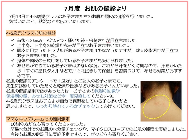 8月度も健診を実施予定。感染症の流行状況をみながら、診察・肌測定を続けてまいります。また、今回の測定結果を基に、さらなる乳幼児の肌に関する研究を進めていく予定です。