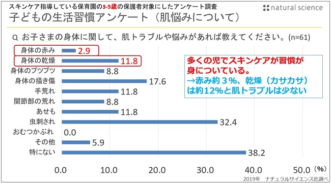 実際に、スキンケア習慣のある保育園児と、まだスキンケアを習慣化していない幼児の保護者を対象としたアンケート調査では、スキンケア習慣のない子の方が乾燥やかゆみなどを感じていることが明らかとなりました。この時期の肌も、まだまだスキンケアを必要としている状態であることがわかります。