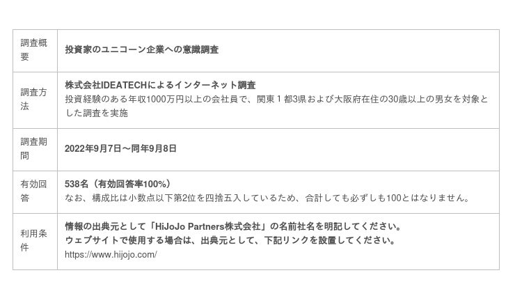 非上場スタートアップ投資プラットフォームのHiJoJo Partners株式会社(本社:東京都港区、代表取締役:スピリドン・メンザス、以下HiJoJo Partners)は、投資経験のある年収1,000万円以上の30代以上の会社員538名を対象としたユニコーン企業への意識調査を実施しましたので、お知らせいたします。