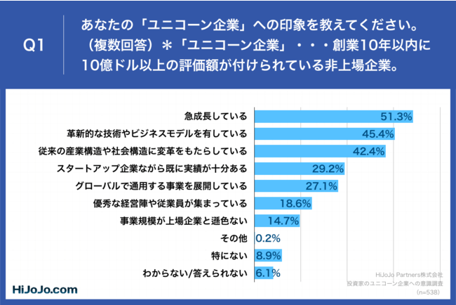「Q1.あなたの「ユニコーン企業」への印象を教えてください。(複数回答)」(n=538)と質問したところ、「急成長している」が51.3%、「革新的な技術やビジネスモデルを有している」が45.4%、「従来の産業構造や社会構造に変革をもたらしている」が42.4%という回答となりました。