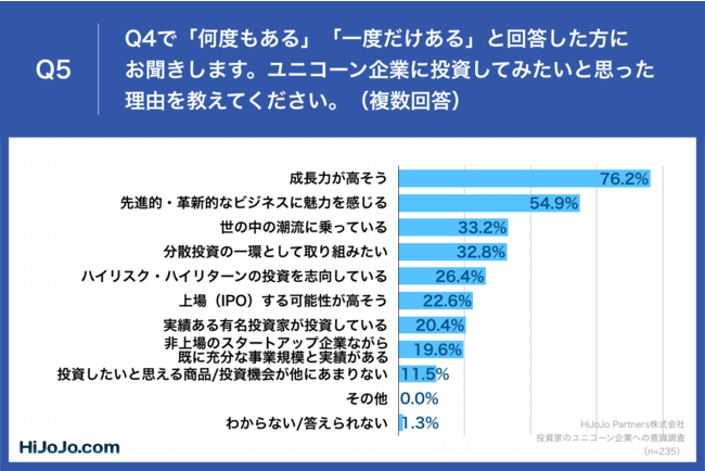 Q4で「何度もある」「一度だけある」と回答した方に、「Q5.ユニコーン企業に投資してみたいと思った理由を教えてください。(複数回答)」(n=235)と質問したところ、「成長力が高そう」が76.2%、「先進的・革新的なビジネスに魅力を感じる」が54.9%、「世の中の潮流に乗っている」が33.2%という回答となりました。