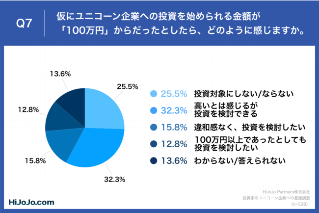 「Q7.仮にユニコーン企業への投資を始められる金額が「100万円」からだったとしたら、どのように感じますか。」(n=538)と質問したところ、「高いとは感じるが投資を検討できる」が32.3%、「違和感なく投資を検討したい」が15.8%という回答となりました。