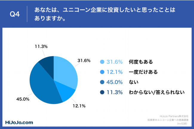 「Q4.あなたは、ユニコーン企業に投資したいと思ったことはありますか。」(n=538)と質問したところ、「何度もある」が31.6%、「一度だけある」が12.1%という回答となりました。