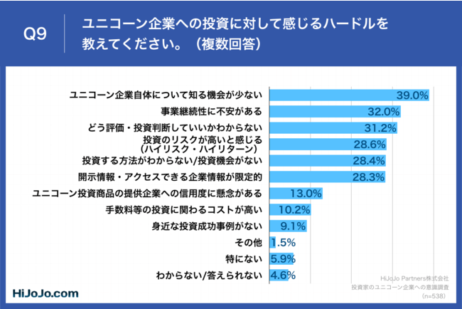 「Q9.ユニコーン企業への投資に対して感じるハードルを教えてください。(複数回答)」(n=538)と質問したところ、「ユニコーン企業自体について知る機会が少ない」が39.0%、「事業継続性に不安がある」が32.0%、「どう評価・投資判断していいかわからない」が31.2%という回答となりました。