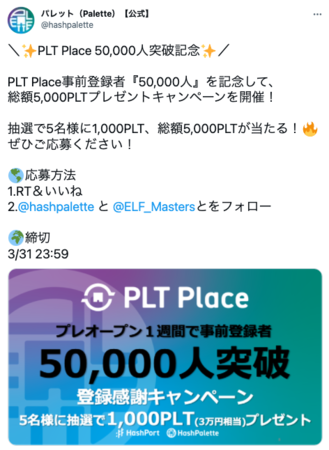 ■「PLT Place 事前登録者50,000人突破記念!5,000PLTプレゼントキャンペーン」について