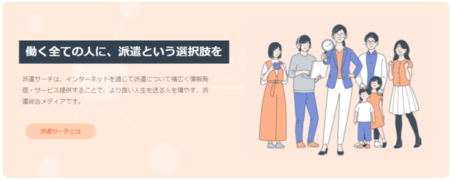 派遣サーチは「働く全ての人に、派遣という選択肢を」というビジョンのもと、「派遣会社の検索」「派遣に関する記事コンテンツ」を配信しています。