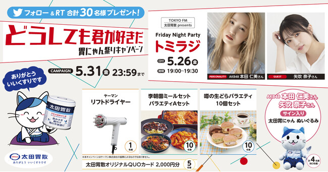 本キャンペーンは同社が提供しているTOKYO FM1ヶ月間限定プログラム『太田胃散 presents Friday Night Party トミラジ』(5月パーソナリティ:AKB48 本田仁美さん 毎週金曜日19:00〜OA)とのコラボ企画となっておりますので、ぜひ番組もお聴きください。