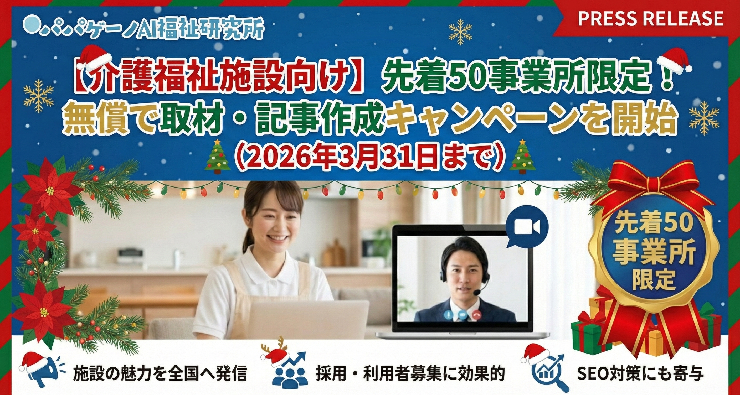 生成AIを活用した就労支援事業やAI支援記録アプリ「AI支援さん」の開発を行う株式会社パパゲーノ(代表取締役:田中康雅、住所:東京都杉並区)は、2025年12月24日(水)より、クリスマスキャンペーンとして、パパゲーノAI福祉研究所において、介護福祉施設向けの無償取材・記事作成キャンペーンを開始いたします。