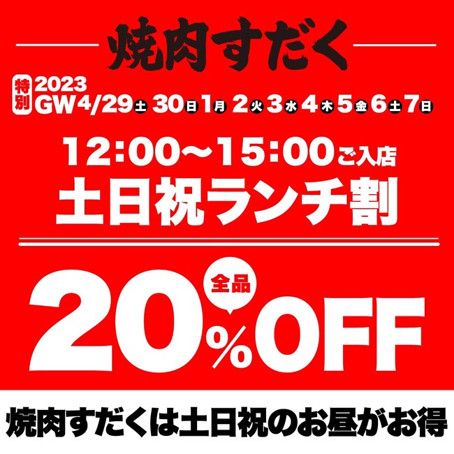 株式会社総合近江牛商社(本社:滋賀県栗東市 代表取締役社長:西野 立寛)が運営する【近江焼肉ホルモンすだく】は、ゴールデンウィーク期間中、全店舗12時〜22時まで営業いたします。さらに、同期間中12時〜15時ご入店のお客様は、全品20%オフのキャンペーンを実施いたします。