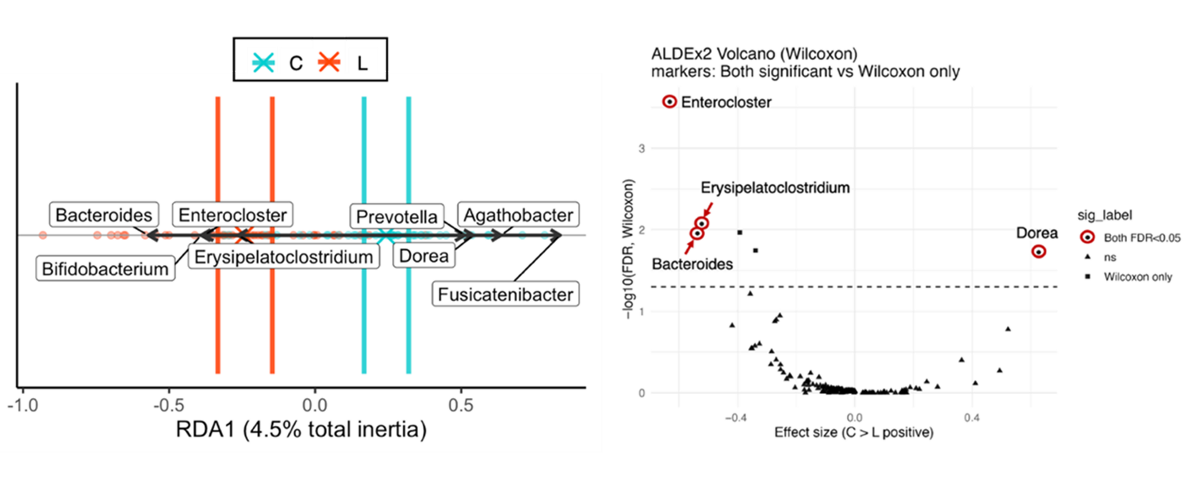 - RDA解析の結果と一致して、ALDEx2(ANOVA-Like Differential Expression tool) では低体重群で炎症と関係する菌(Bacteroides, Enterocloster, Erysipelatoclostridium )が増加し、正常体重群でDoreaが増加した。