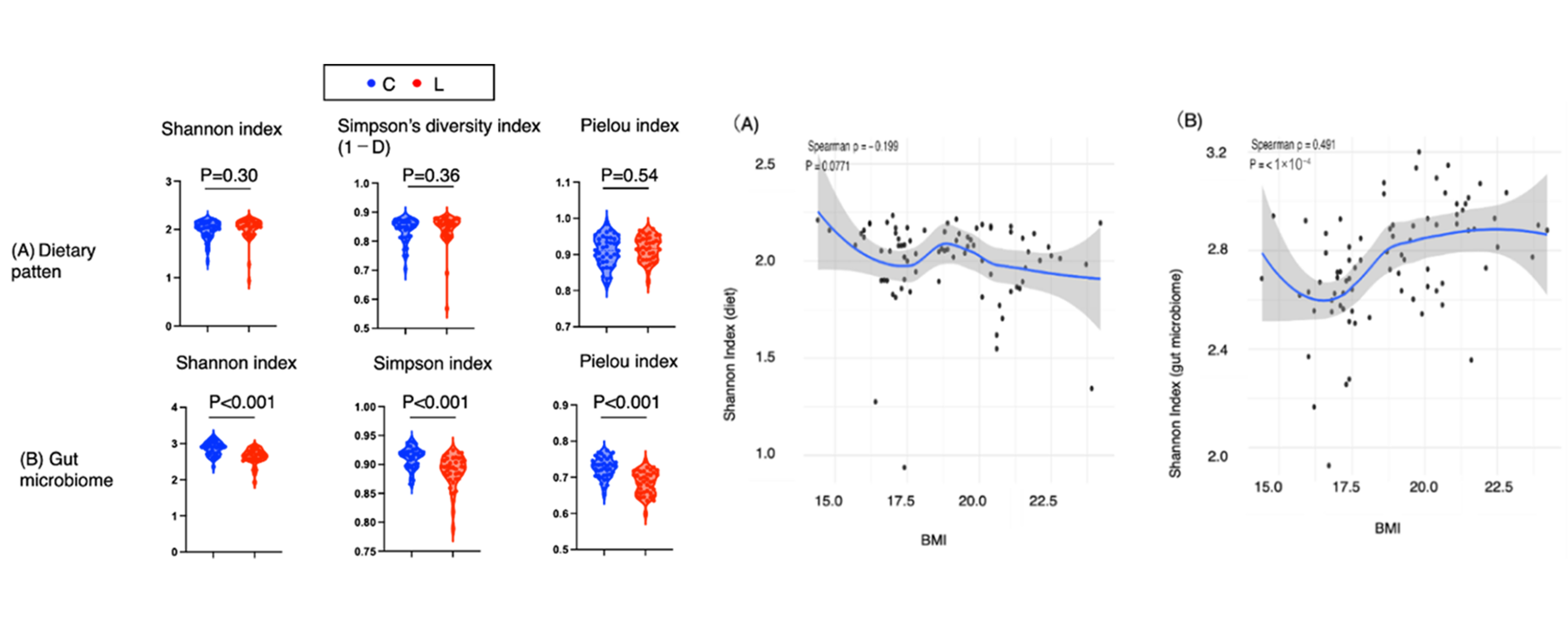 【図1】左は食事(A)と腸内細菌叢(B)における正常体重(C)と低体重者(L)間のα多様性の比較、右図はBMIと食事パターン(A)や腸内細菌パターン(B)のα多様性の関係を示す