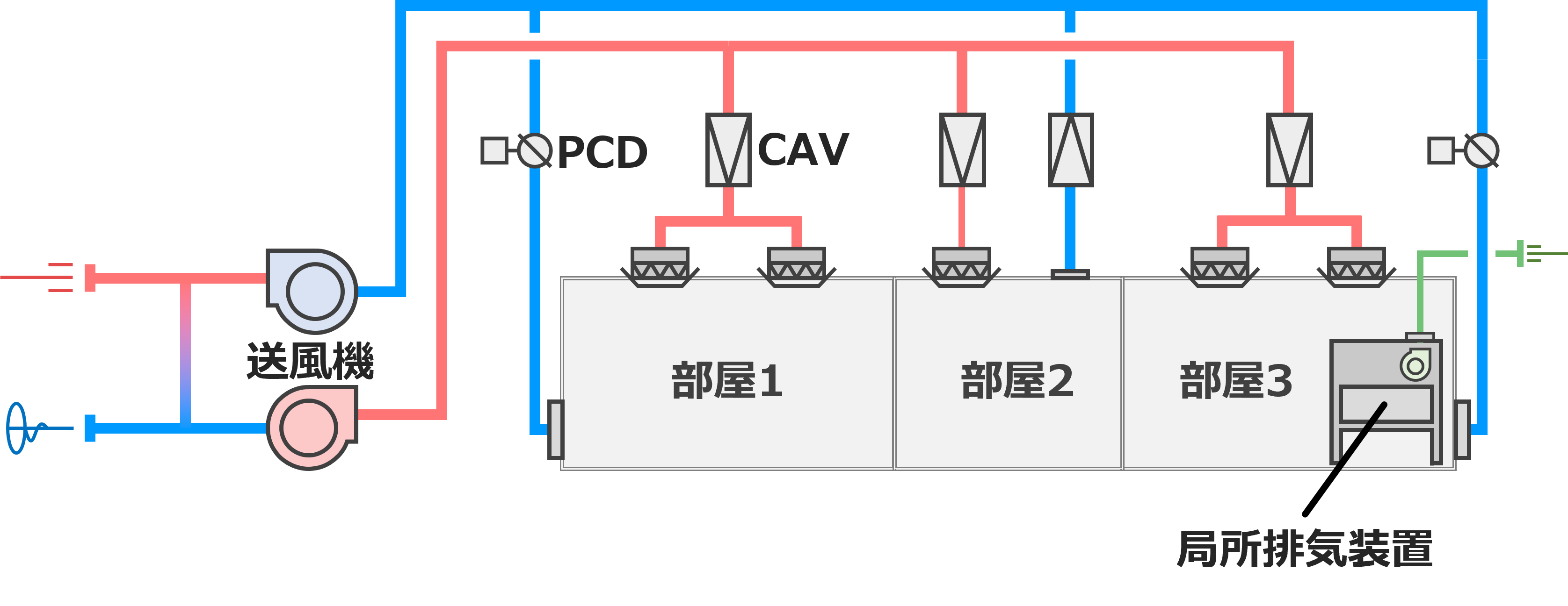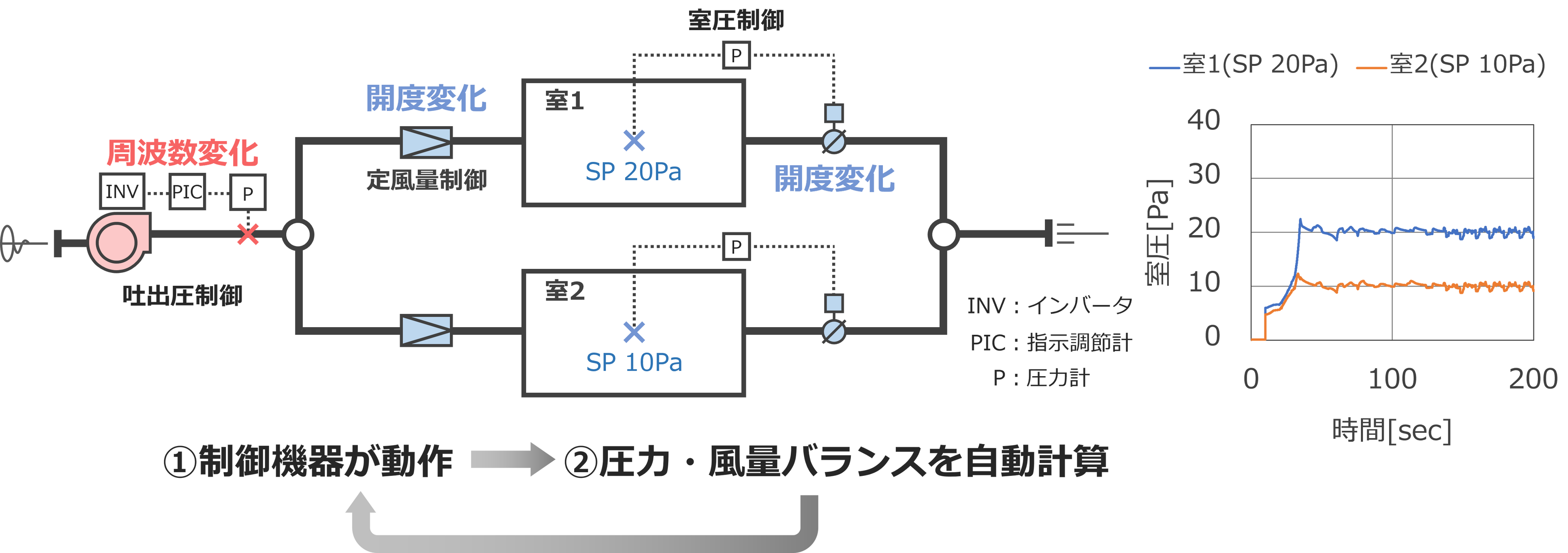 クリーンルームにおいて、清浄度を維持するための室圧管理は極めて重要であり、施工完了後の試運転調整では、運転パターンや局所排気設備の稼働状況に応じた調整が求められます。室圧や給気風量の確認・調整には多くの手順やノウハウが必要であり、時間を費やすため、効率化が課題となっていました。