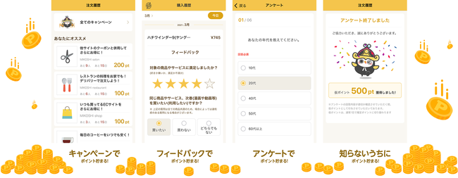さらには、アプリ内で指定のサイトで購入したり、購入した商品へのフィードバック、アンケート回答などさまざまな方法でためることができます。