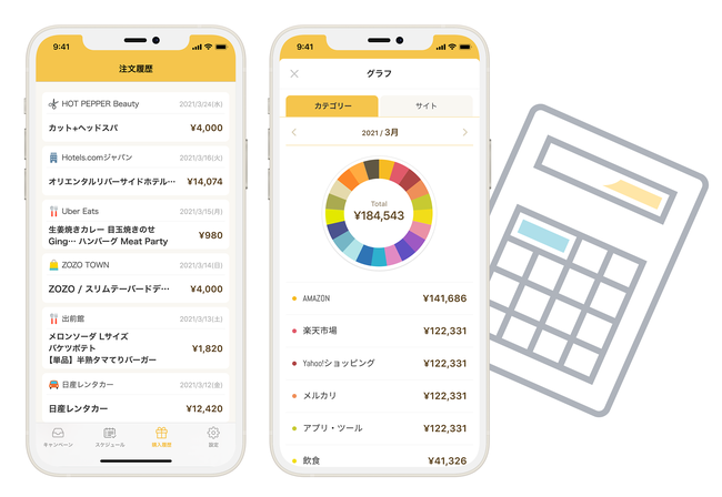 ECの取引履歴をグラフ表示することもでき、EC家計簿として毎月の支出状況を確認することができます。