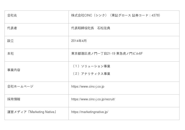 CINCは、「マーケティングソリューションで日本を代表する会社を創る」をビジョンに掲げ、ビッグデータの活用を強みとしたWebマーケティングのツール開発からマーケティングコンサルティングを展開しています。独自のデータ収集技術、AI・機械学習技術と、データ解析の知見を基に、誰もが・短時間で・簡単に・高度なビッグデータ解析ができるツールの開発・提供、プロフェッショナルが戦略立案から実行支援まで一気通貫で伴走するマーケティングコンサルティングの提供を通じて、クライアントのビジネスの成長に貢献します。