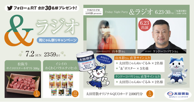 株式会社太田胃散(本社:東京都文京区/代表取締役社長:太田淳之)は、『&ラジオ 胃にゃん祭りキャンペーン』として、山本彩さん、ケンドーコバヤシさんの「直筆サイン入り太田胃にゃんぬいぐるみ」や山本彩さんの「直筆サイン入り“&”ポスター」、「松阪牛サイコロステーキギフト 500g」、「イシイのわくわくバラエティセット」、「太田胃散オリジナルQUOカード2,000円分」が合計30名に当たるキャンペーンを2023年6月23日(金)10:00〜7月2日(日)23:59の期間で実施します。