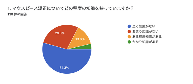 マウスピース矯正は、見た目の違和感が少なく、取り外し可能な点が特長で、特に成人の矯正治療において人気を集めていますが、今回の調査により、「マウスピース矯正についてどのくらいの知識を持っていますか」という質問に対して、全く知識がないと答えた人が54.3%にも上り、あまり知識がないと答えた人が28.3%でした。これは、日本国民の約8割がマウスピース矯正についてほとんど、または全く知らないことを示しています。一方で、ある程度知識があると答えた人は13.8%、かなり知識があると答えた人はわずか3.6%に留まりました。