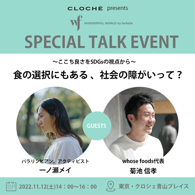 クロシェで初めての【wfスペシャルトークイベント】一ノ瀬メイ×菊池信孝「食の選択にもある、社会の障がいって?」リアル開催・10月10日からオンラインでチケット発売開始