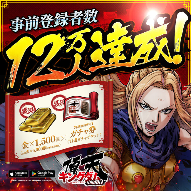 『キングダム 頂天』の事前登録者が12万人を突破いたしましたので、リリース後に金6,000個、【事前登録専用】ガチャ券(11連ガチャチケット)2枚、そして★3 河了貂 1体を皆様にプレゼントいたします。誠にありがとうございます!