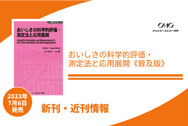 食品・化学・バイオテクノロジーなどの技術・市場動向レポート発行やセミナー開催を行う、株式会社シーエムシー出版(本社:東京都千代田区、代表:辻賢司)は、書籍『おいしさの科学的評価・測定法と応用展開《普及版》(監修:阿部啓子・石丸喜朗)』を2023年7月6日に発刊いたします。定価は税込3,520円(本体価格3,200円+税)で、当社ECサイトおよび全国の書店でご注文を受け付けております。目次などの詳細については以下の当社サイトをご覧ください。こちらの商品は弊社電子書籍専用販売サイト「CMCeBook」にて電子版(DL版)も販売しております。