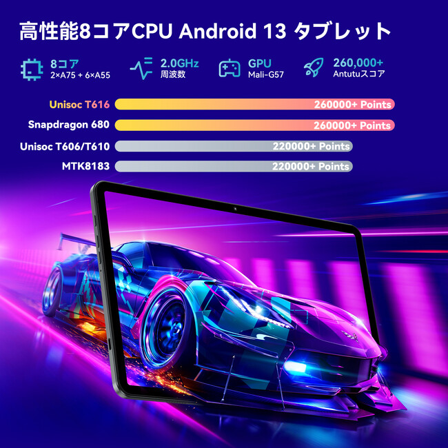 このHeadwolf HPad2 Proタブレットは、Unisoc Tiger T616チップを搭載しており、スマートなオフィス作業、効率的な学習、メディアエンターテイメントなど、さまざまなシーンで優れたパフォーマンスを発揮します。12nmの省電力製造プロセスを採用し、省電力性と発熱の軽減を実現しています。2つの大型A75コア(2.0GHz)と6つのA55コア(1.8GHz)の組み合わせにより、高性能なAIチップが搭載されており、アントゥトゥベンチマークスコアは260,000を超える高速な演算が可能です。