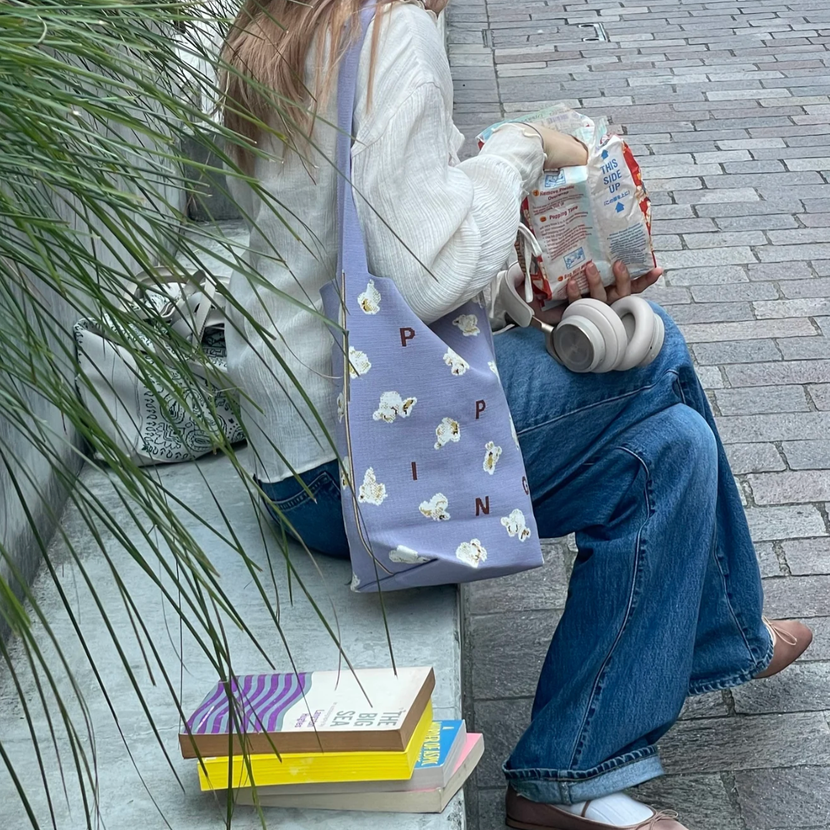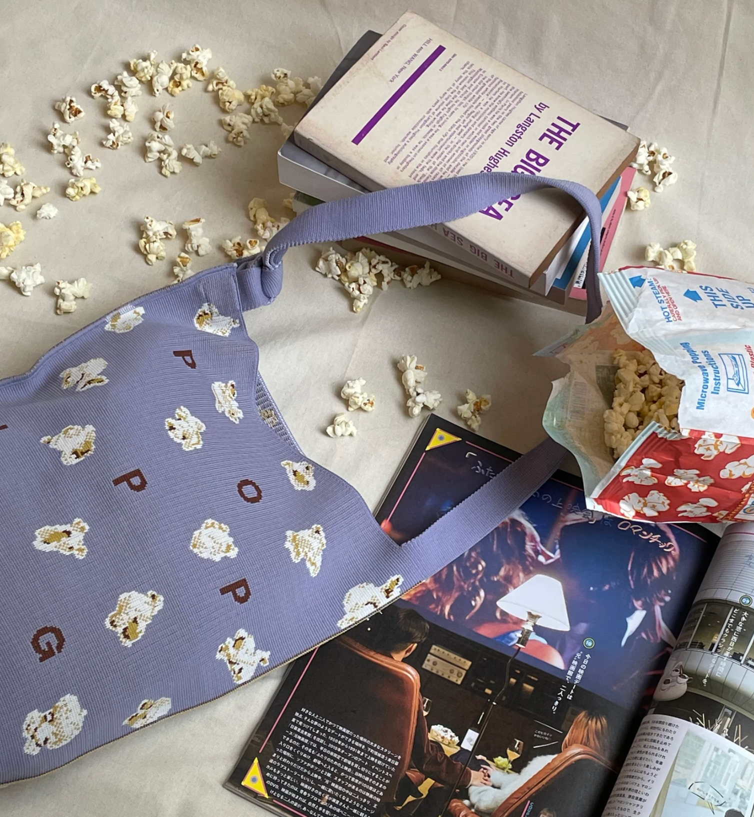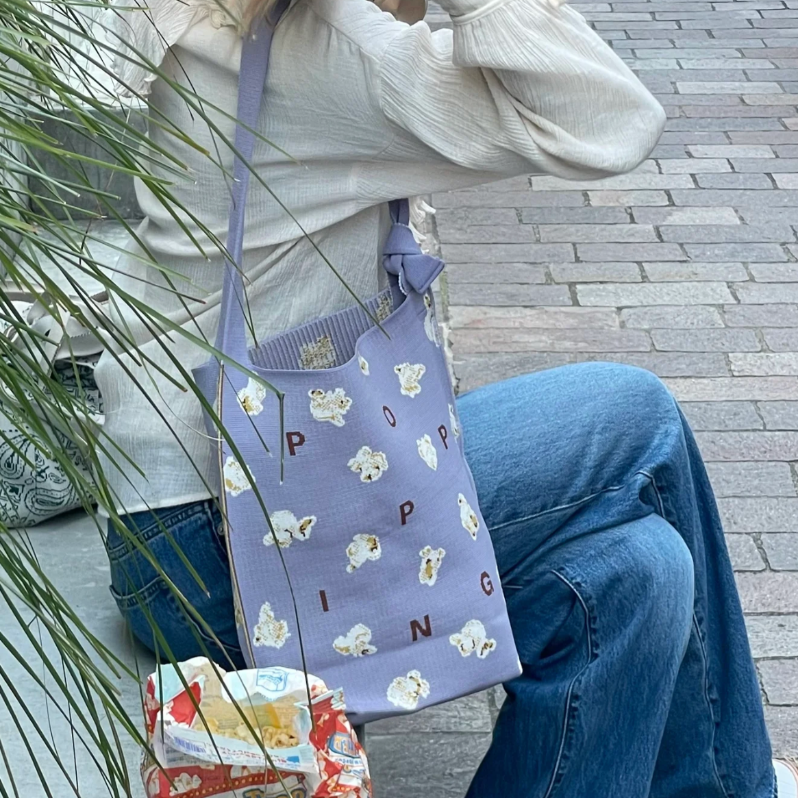 淡い紫色の配色がポップコーンとも相性抜群で、ファッションのワンポイントとしても活躍します。