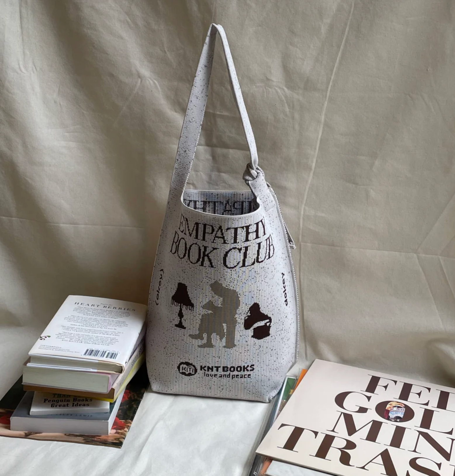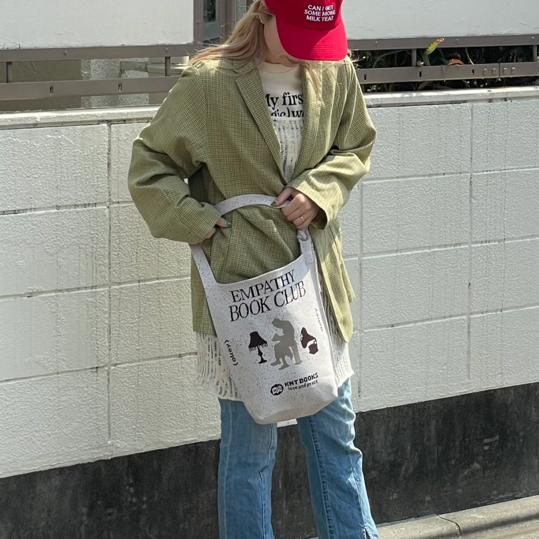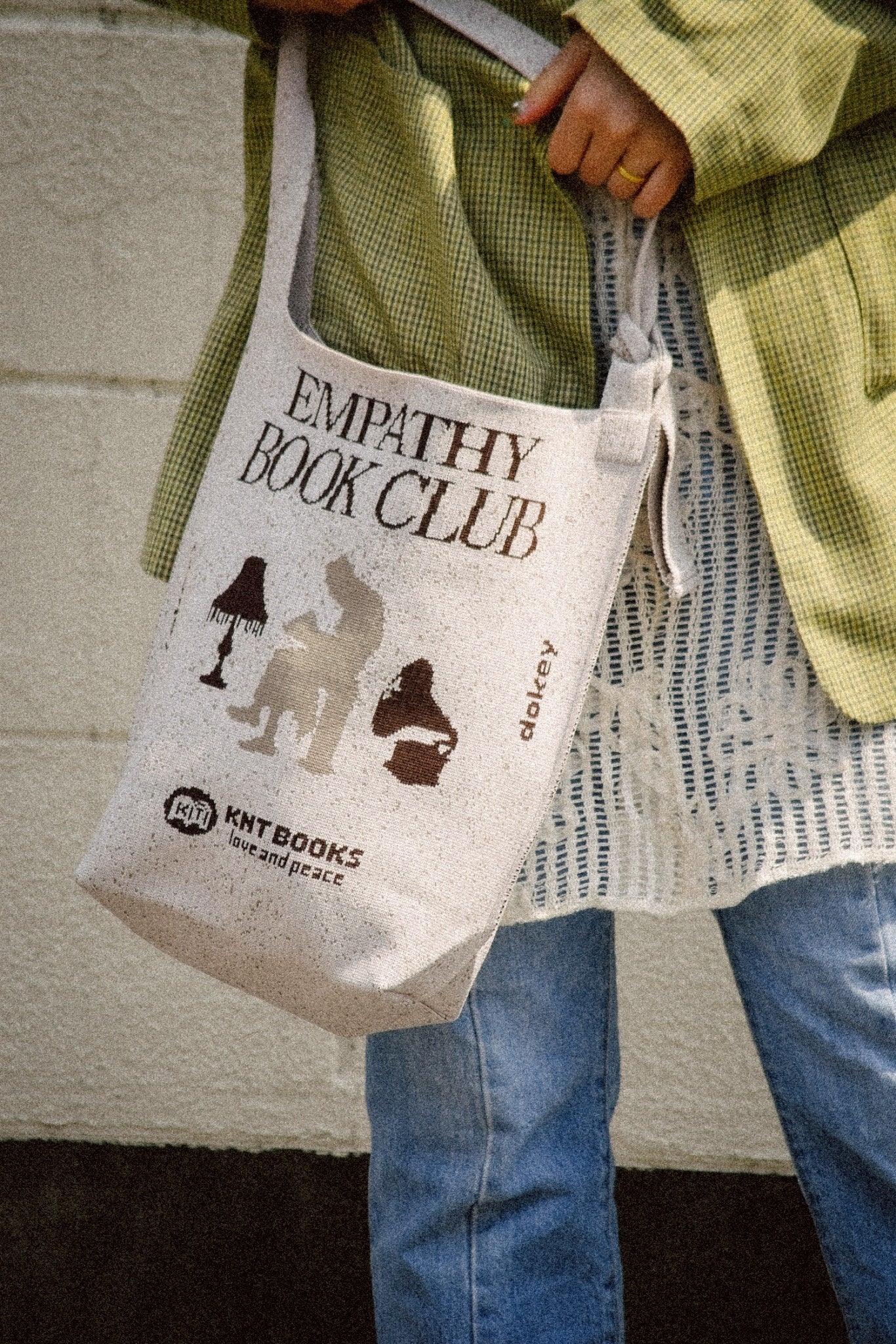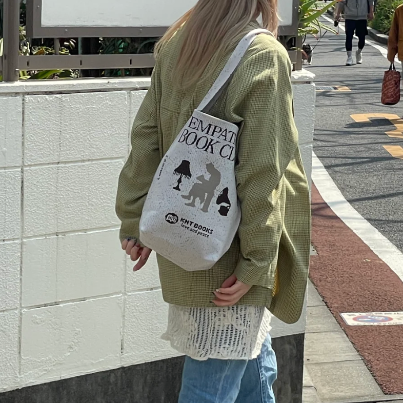 粒々とした砂のようなパターンに、「EMPATHY BOOK CLUB」のメッセージが施された印象的なデザインのバッグ。