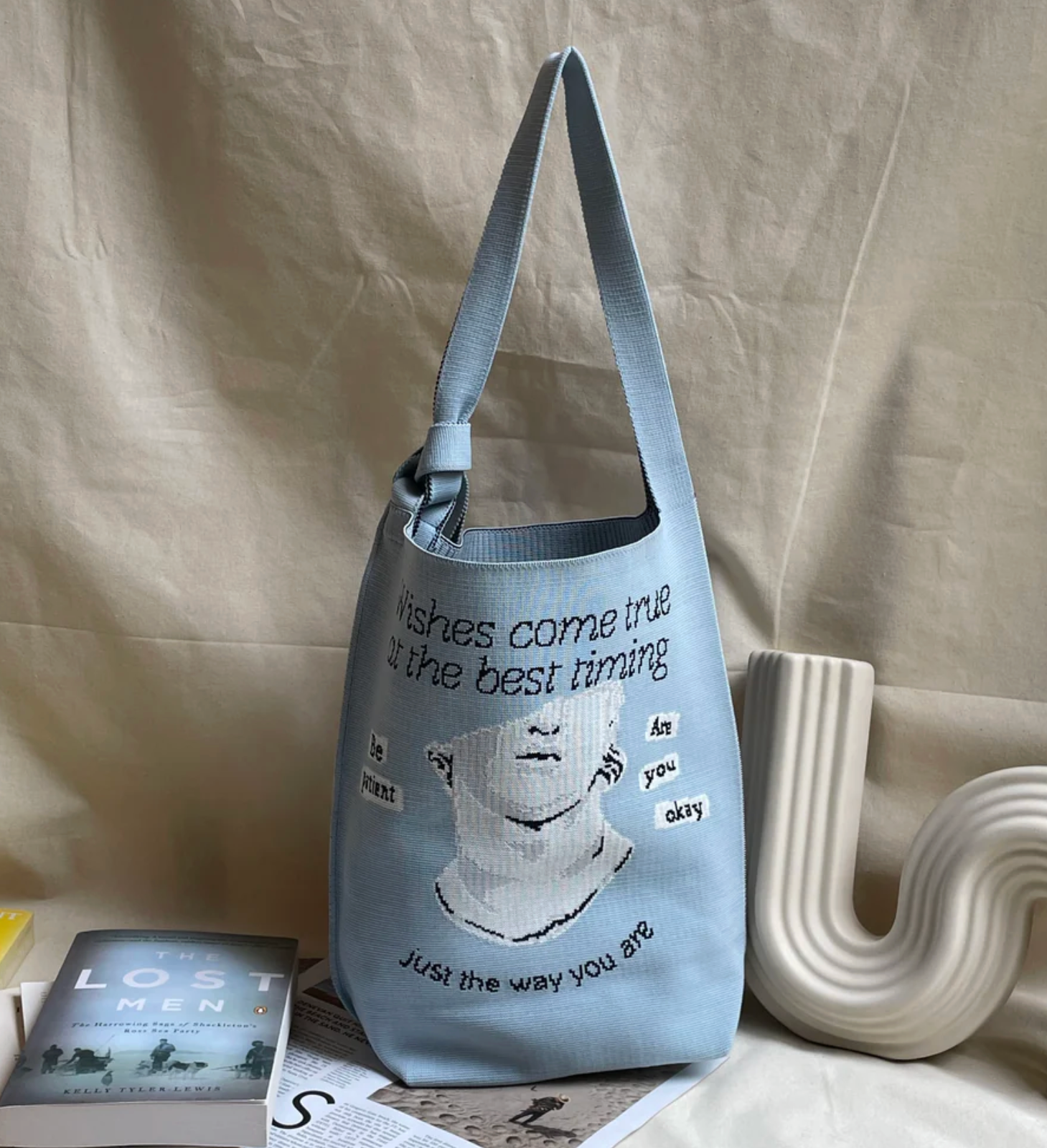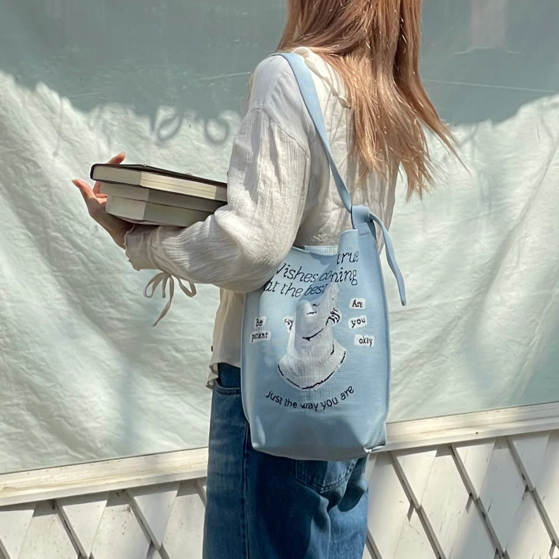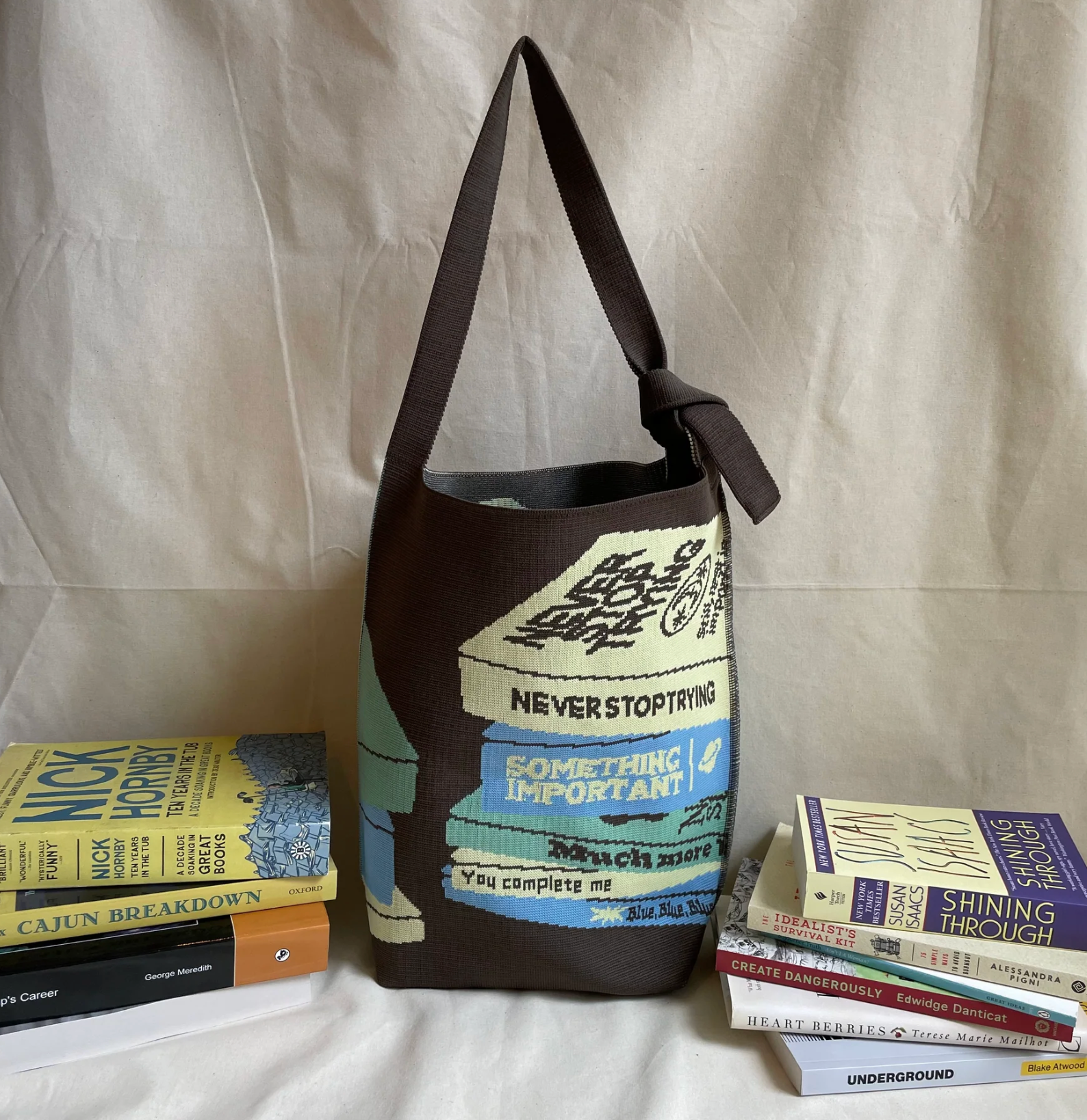 粒々とした砂のようなパターンに、「EMPATHY BOOK CLUB」のメッセージが施された印象的なデザインのバッグ。