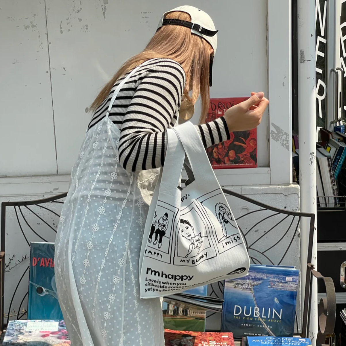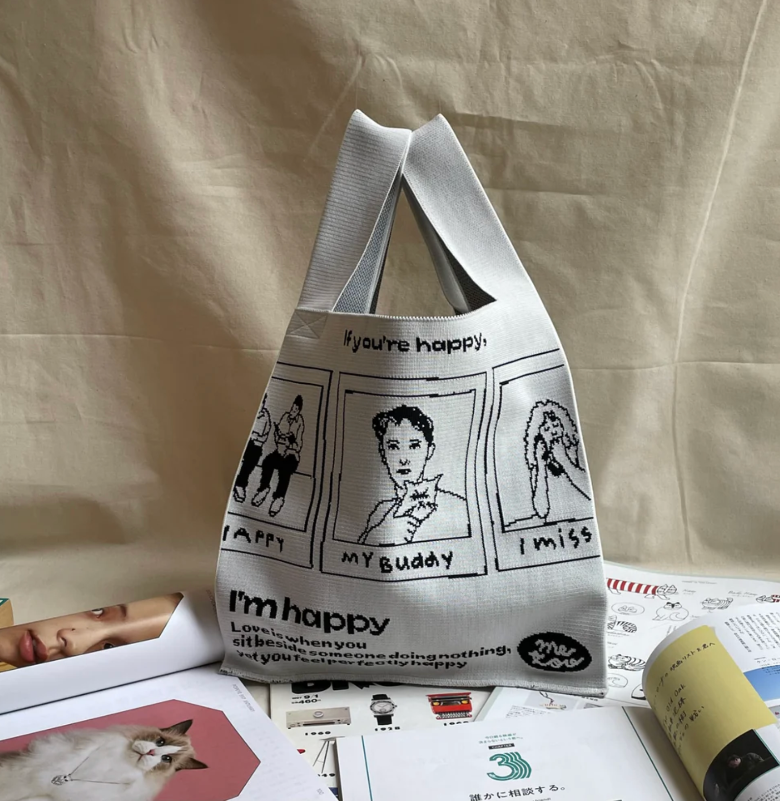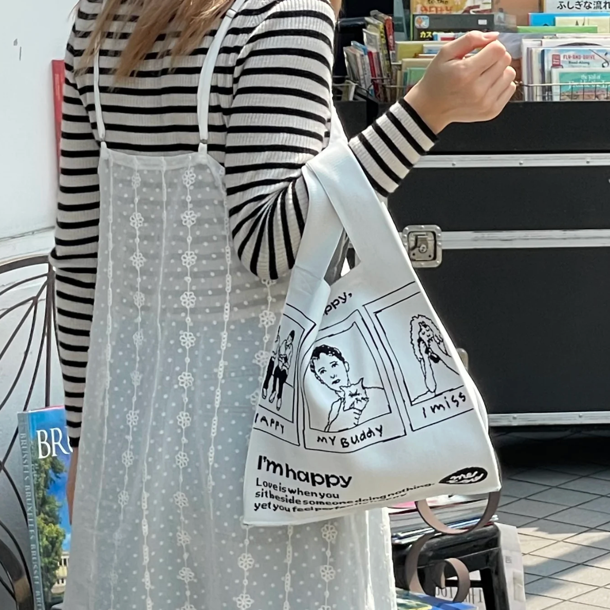 映画を連想させる、ポラロイド風のイラストが目を引くバッグ。