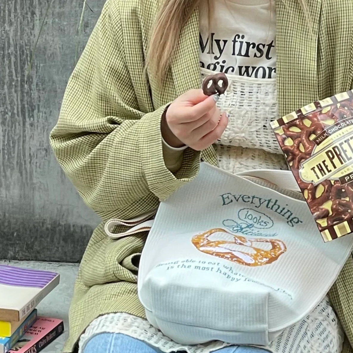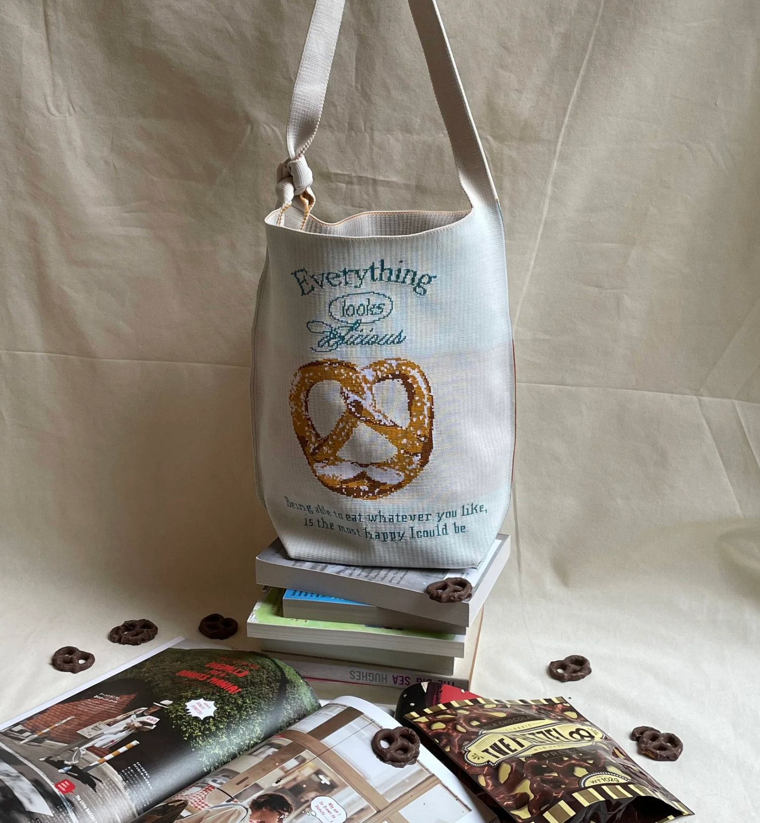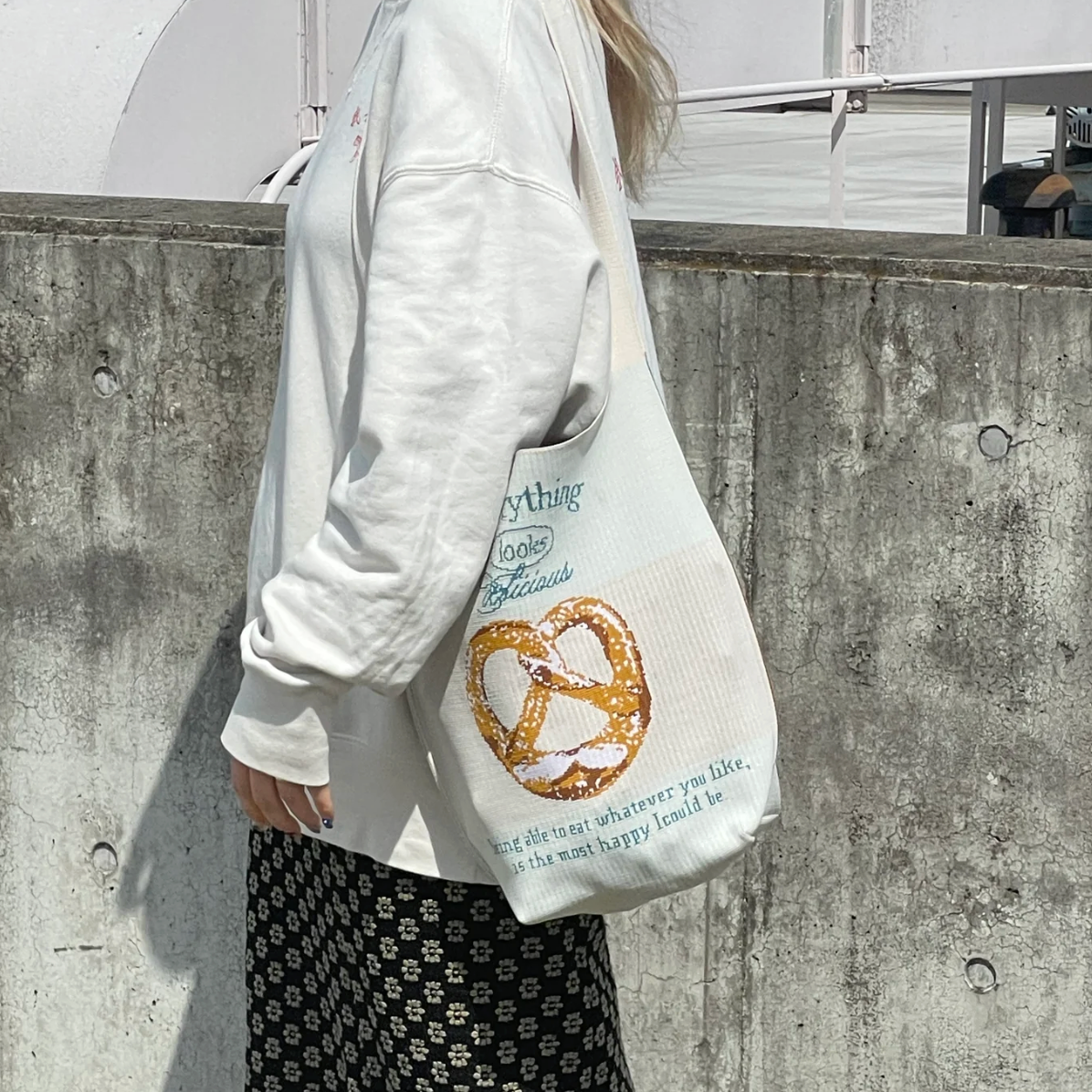メインカラーがホワイトなのでどんな服装にも合わせやすく、プレッツェルのデザインが目を惹き、ついお腹が空いてしまいそうです。
